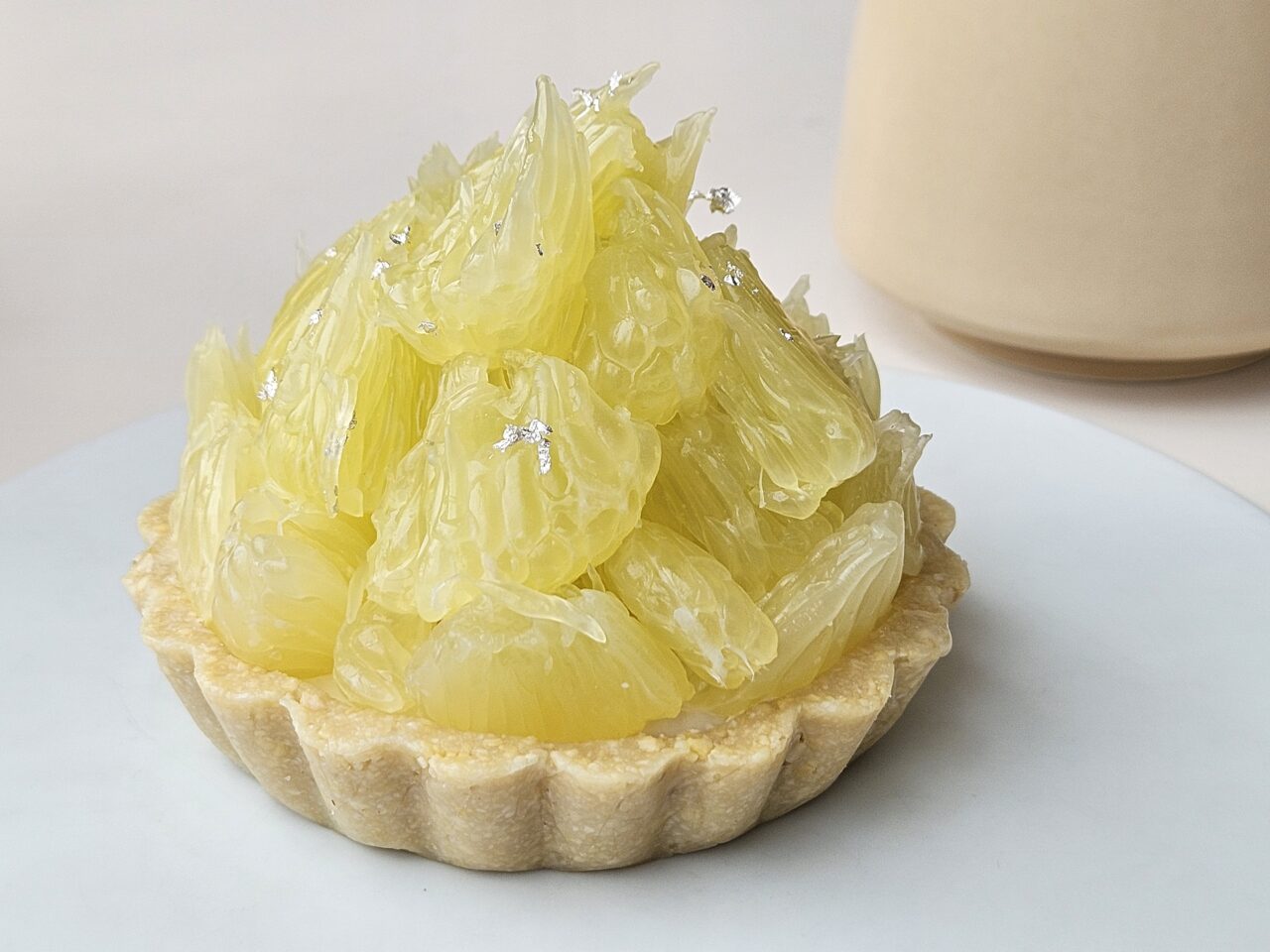 注文した「高知県産 宿毛文旦」のタルト(1,600円)です。繊細に盛り付けられた果実がまるで宝石のように輝いています。
